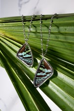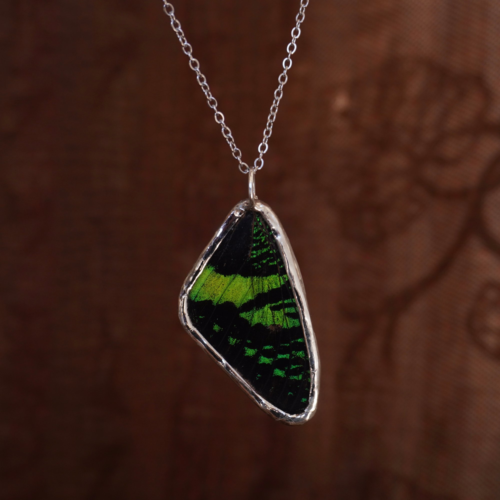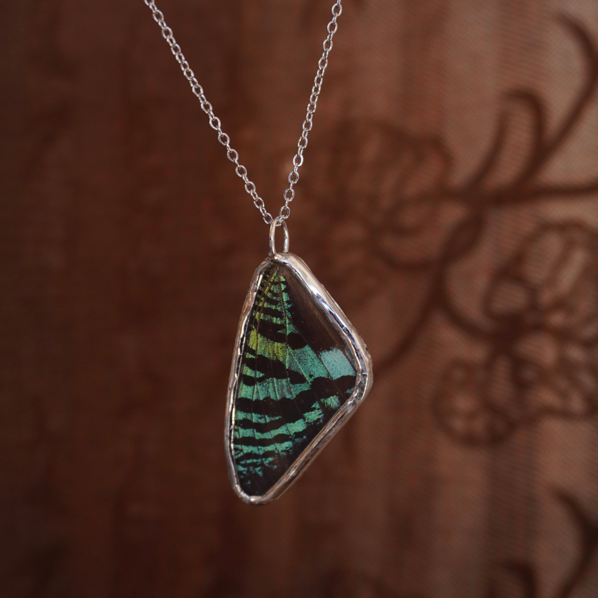 The Sunset Moth (Chrysiridia rhipheus) is native to Madagascar and is known for its incredibly vibrant, iridescent wings. The color doesn’t come from pigment, but from microscopic scales that reflect and bend light, creating its metallic rainbow effect. Each pendant features a single Sunset Moth wing with naturally different colors on each side, one shows more green and the other more blue. The reversible design lets you wear the necklace with either side facing forward.